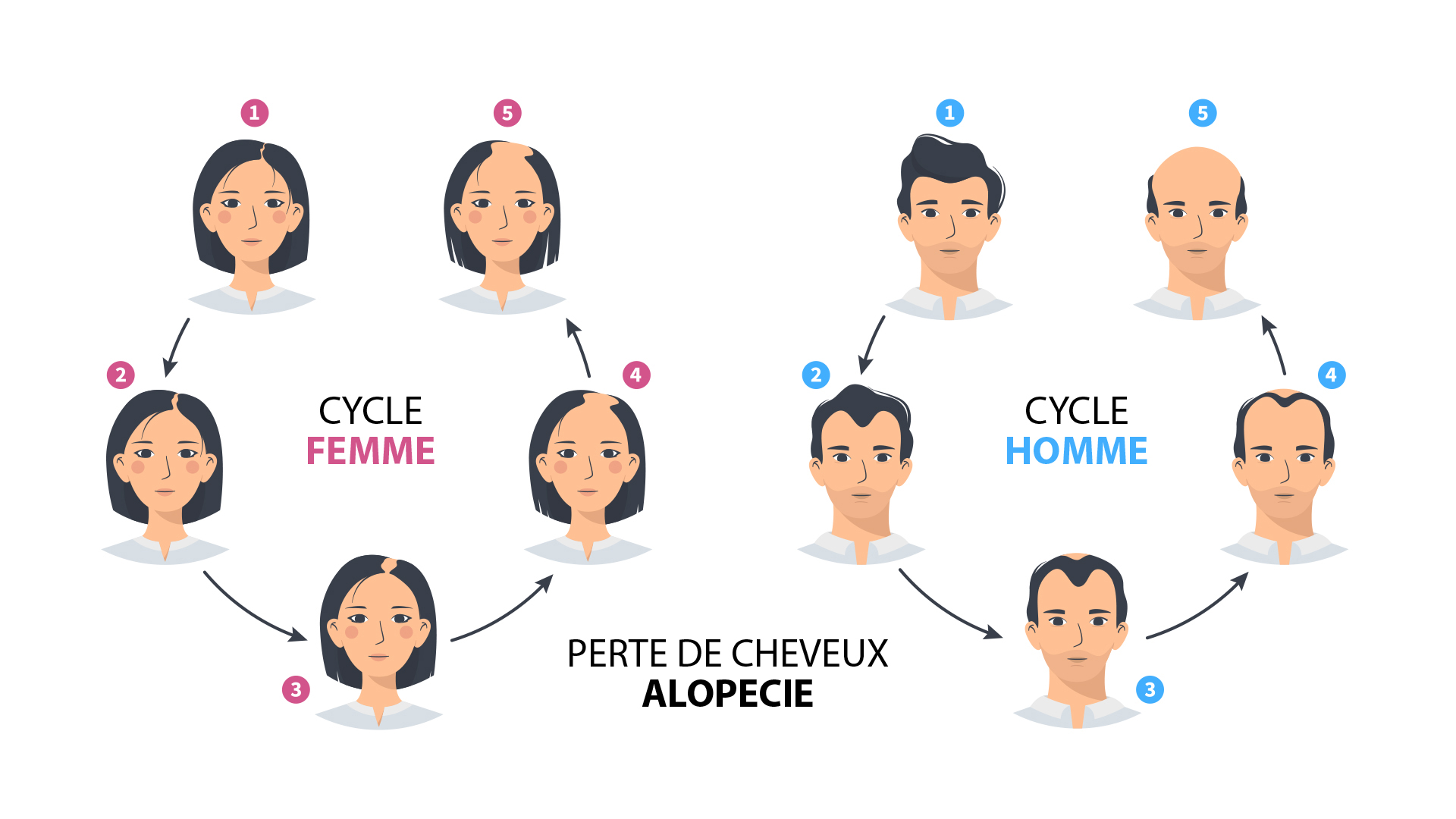Chez les hommes, cette perte de cheveux suit généralement un schéma caractéristique décrit par l’échelle de Norwood-Hamilton. Elle commence souvent par un recul de la ligne frontale au niveau des tempes, suivi par l’apparition d’une zone chauve sur le sommet du crâne (vertex). Au fil du temps, ces deux zones peuvent se rejoindre, ne laissant qu’une couronne de cheveux sur les côtés et l’arrière de la tête.